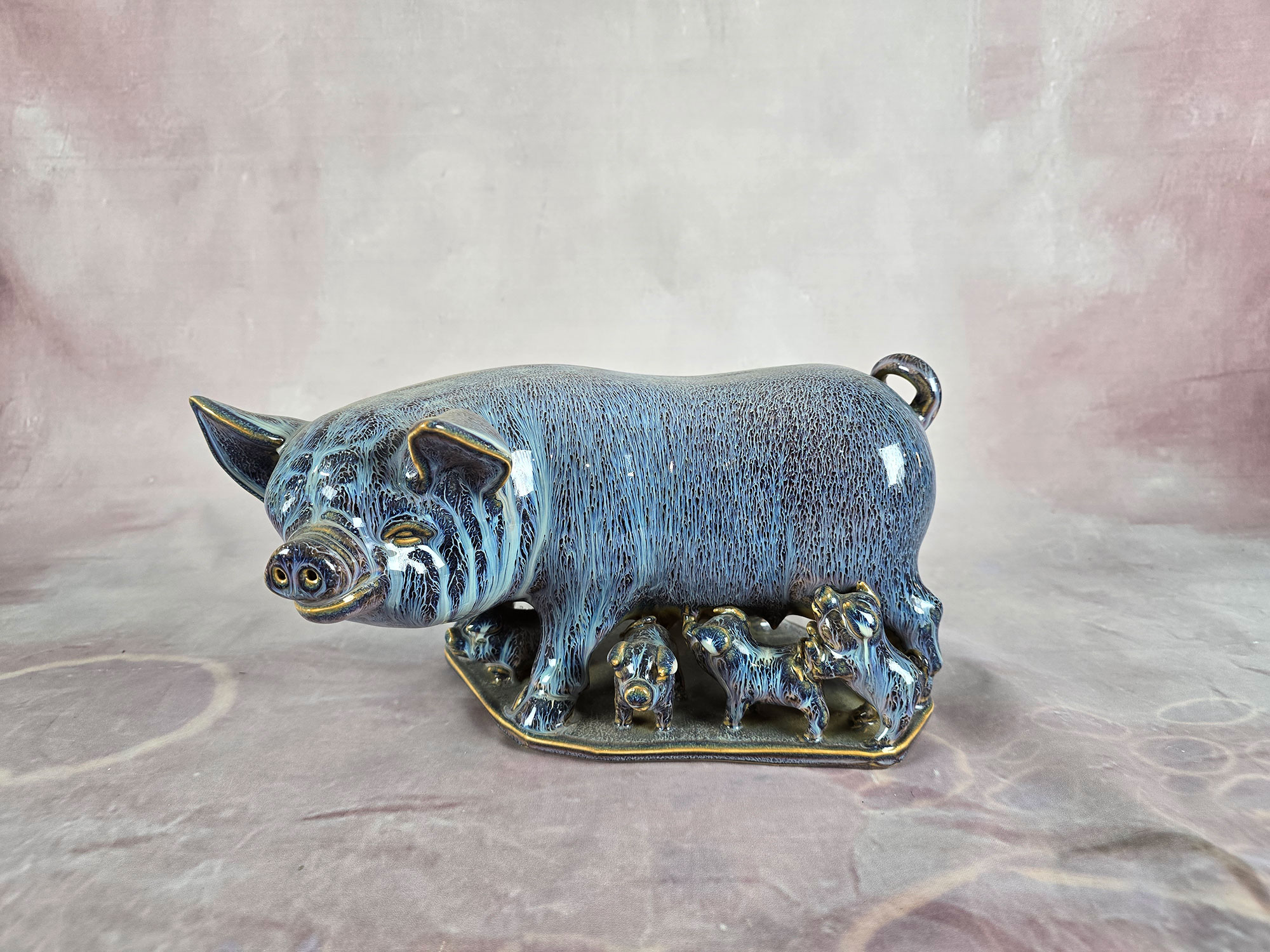 Home / Porcelain / Flambe Sow Flambe Sow Category: Porcelain Tags: flambe, piglets, sow A porcelain flambe sow with five piglets. Length 32cm. Height 16cm. Related products Yellow-Ground Flower Jar Read more Tile Porcelain of Fishes Read more Lions and Chrysanthemum Vase Read more Turquoise Coloured Magnolia Vase Read more